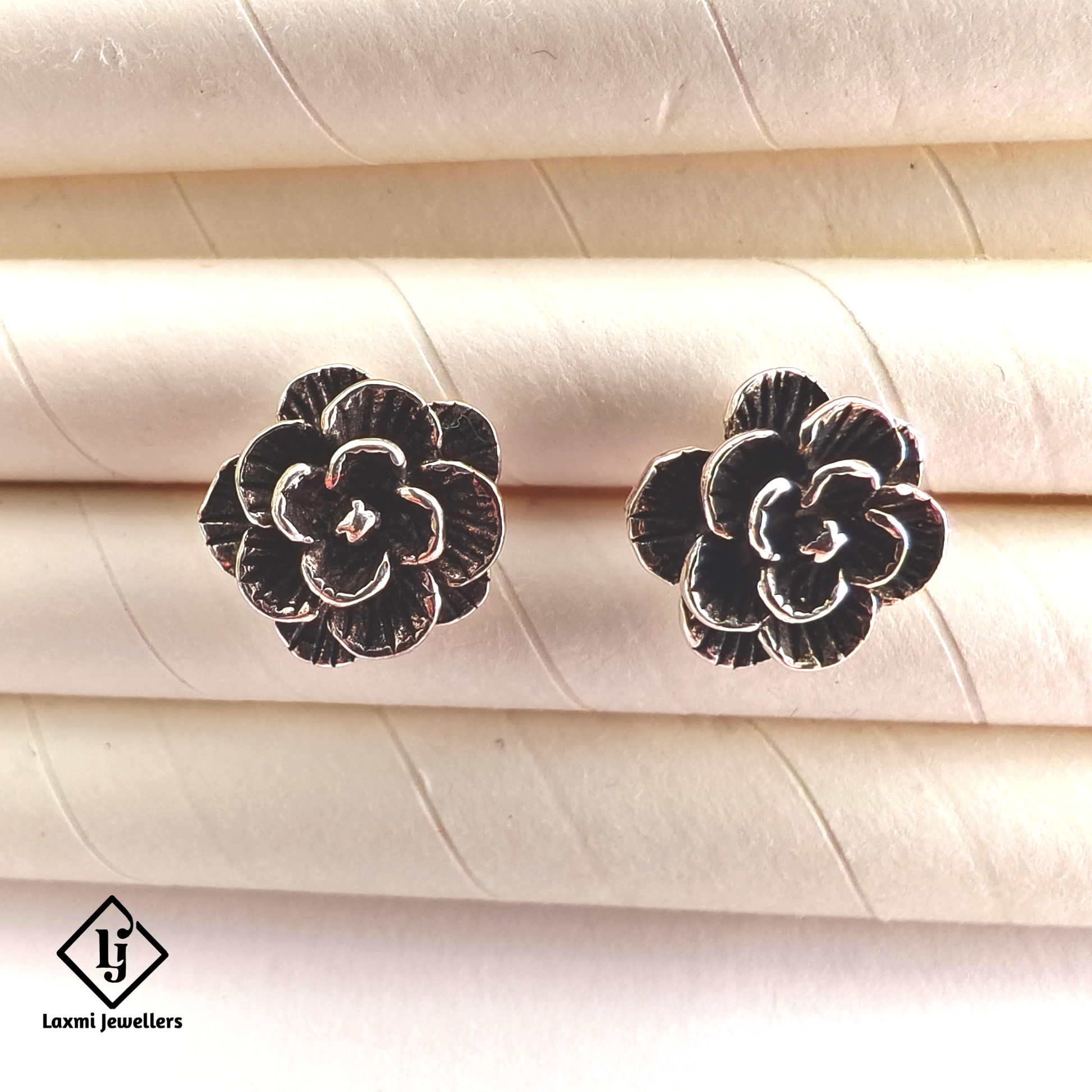 925 Sterling Silver Oxidised Flower Stud Earrings | Handmade Silver Earrings for Women